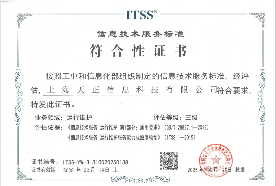 喜報(bào)!熱烈慶祝天正信息成功通過(guò)ITSS三級(jí)認(rèn)證,邁向服務(wù)新高度!